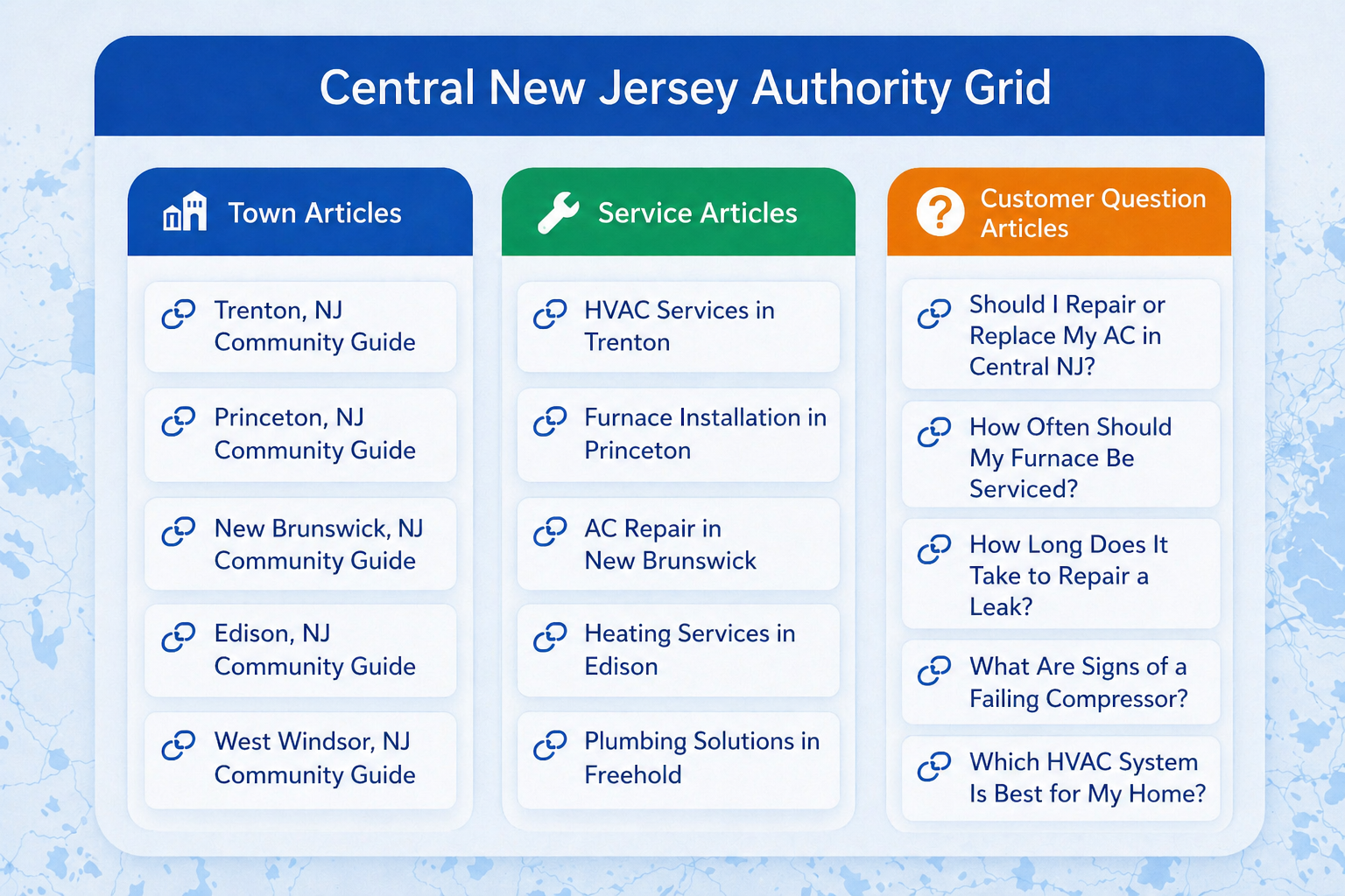 Together these articles form a connected network of information that helps businesses develop authority across both services and geographic areas.