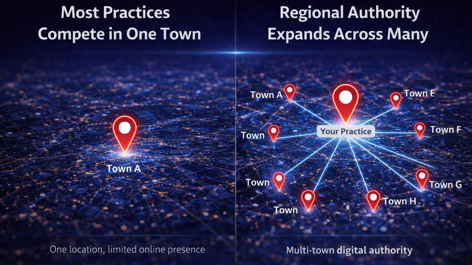 Outside that radius, the practice often becomes invisible to patients searching from nearby towns.