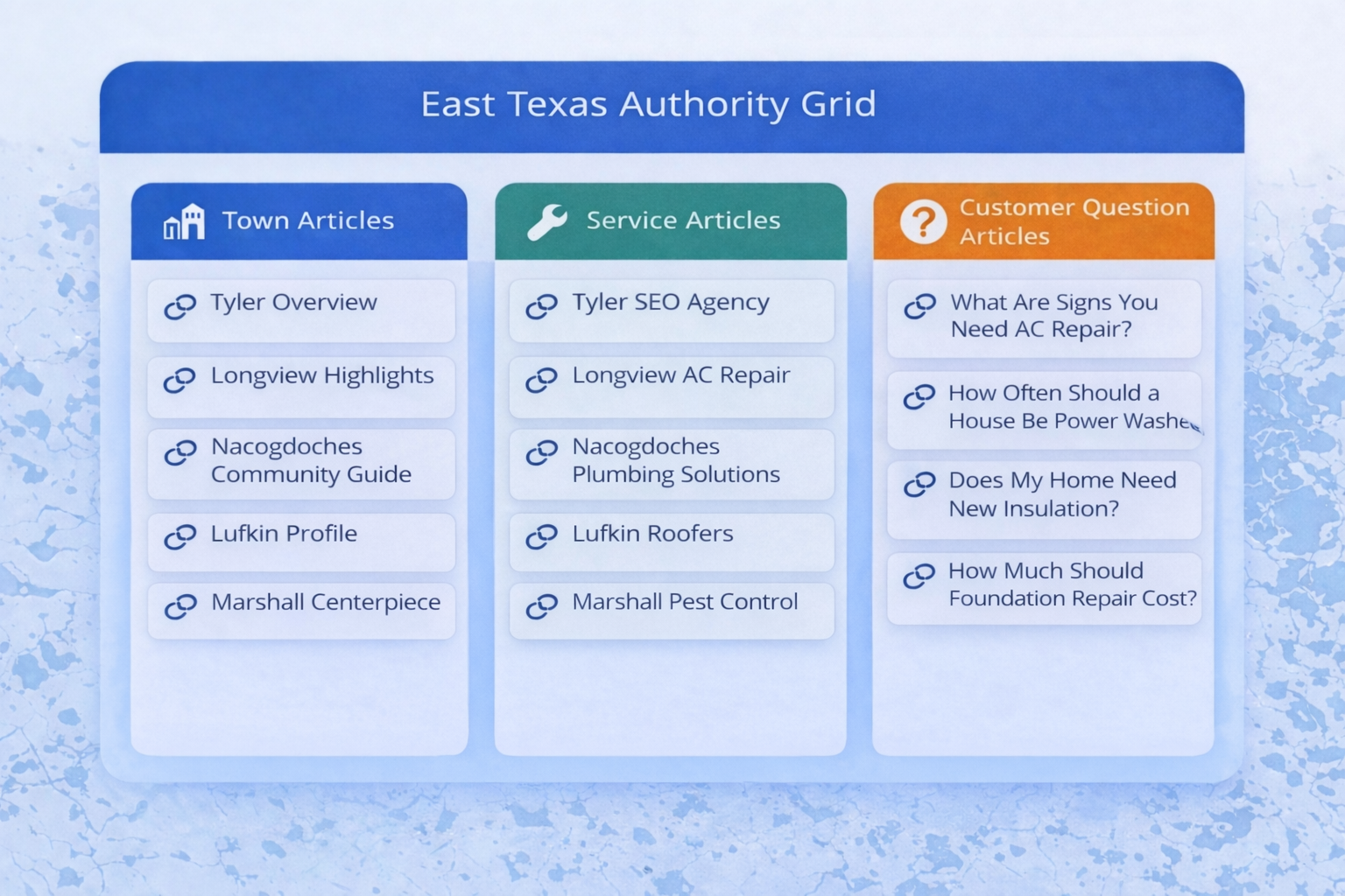 Together these articles form a connected network of information that helps businesses develop authority across both services and geographic areas.