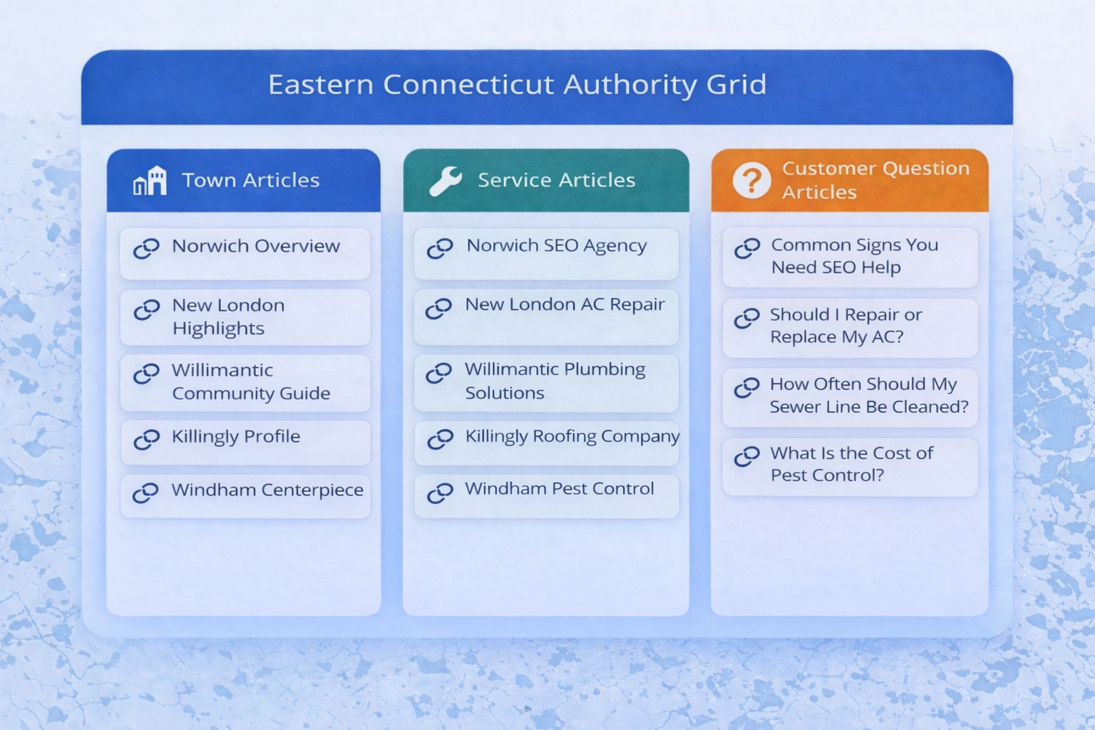 Together these articles form a connected network of information that helps businesses develop authority across both services and geographic areas.