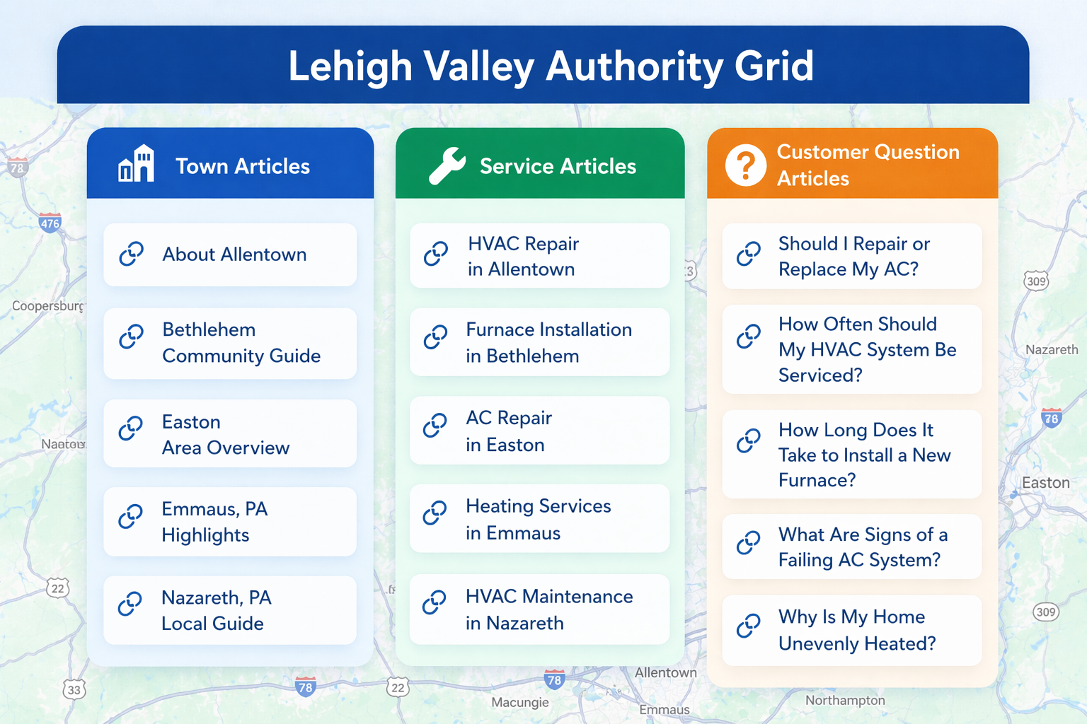 Together these articles form a connected network of information that helps businesses develop authority across both services and geographic areas.