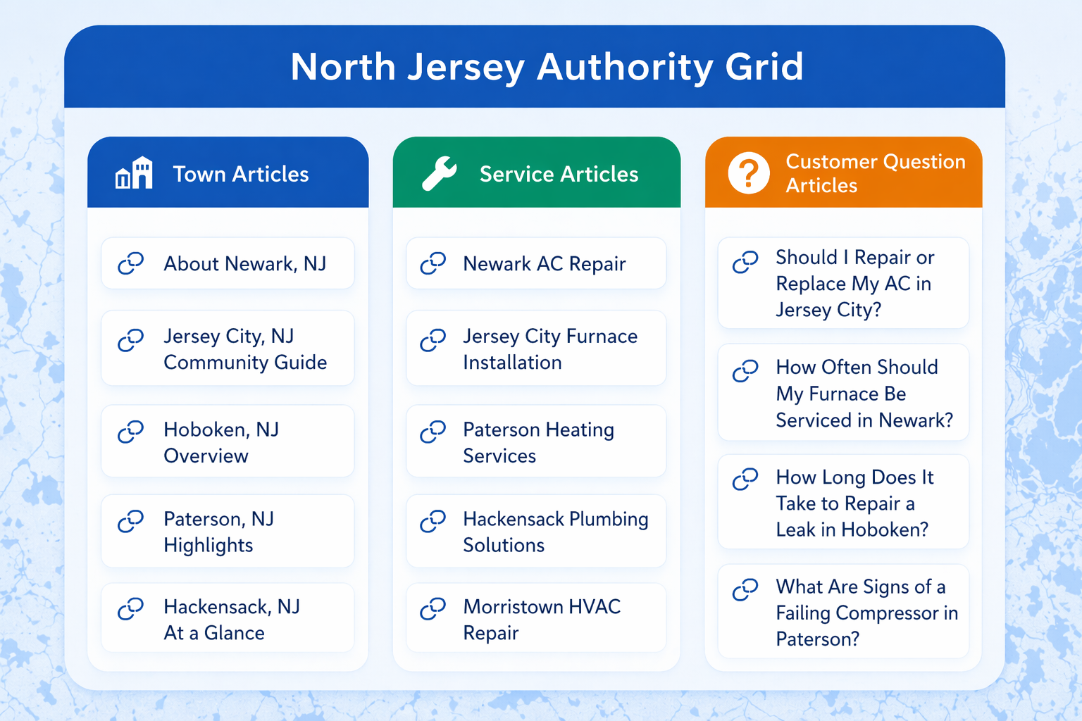 Together these articles form a connected network of information that helps businesses develop authority across both services and geographic areas.