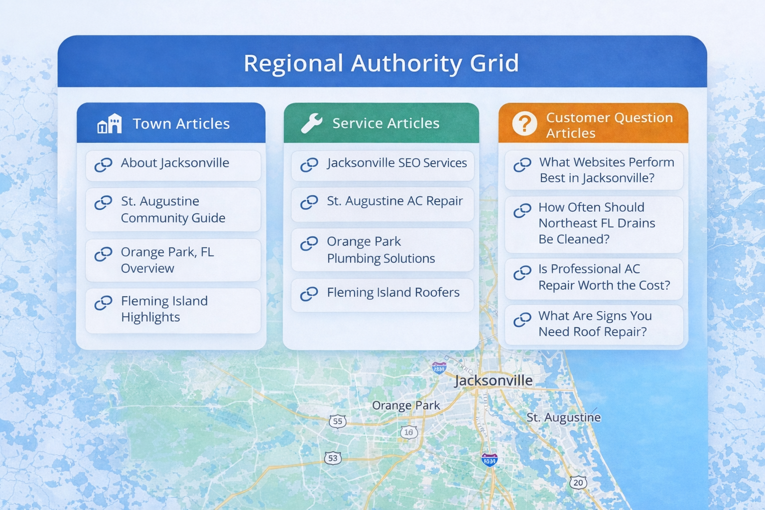 Together these articles form a connected network of information that helps businesses develop authority across both services and geographic areas.