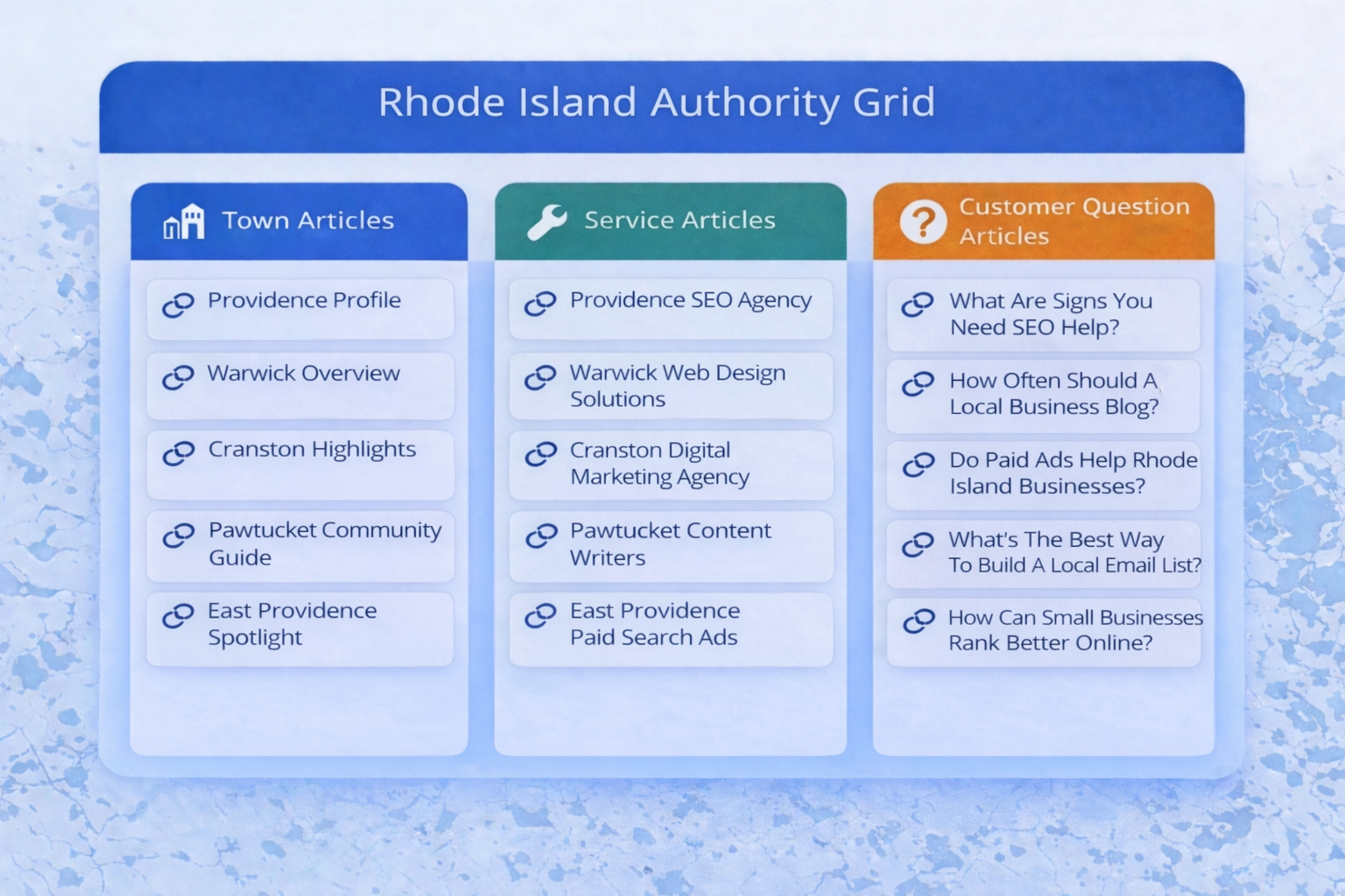Together these articles form a connected network of information that helps businesses develop authority across both services and geographic areas.