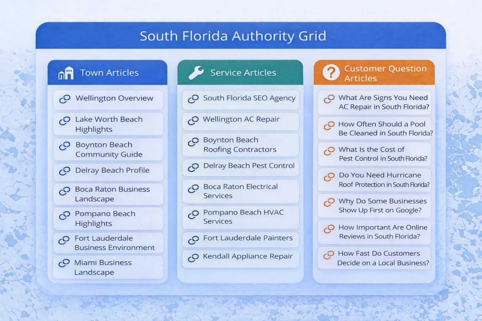 Together these articles form a connected network of information that helps businesses develop authority across both services and geographic areas.