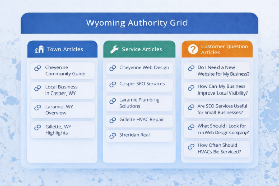 Together these articles form a connected network of information that helps businesses develop authority across both services and geographic areas.